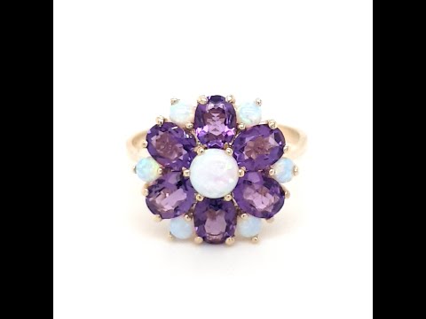 9ct Yellow Gold Opal & Amethyst Large Flower Cluster Ring Size M R280