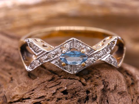 9ct Yellow Gold Blue Topaz & Diamond Cross Over Ring Size O British Made