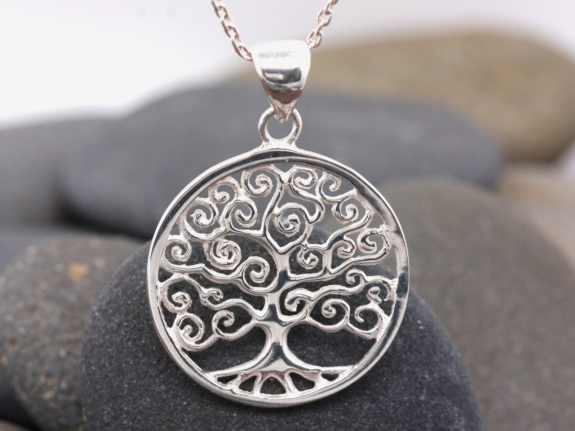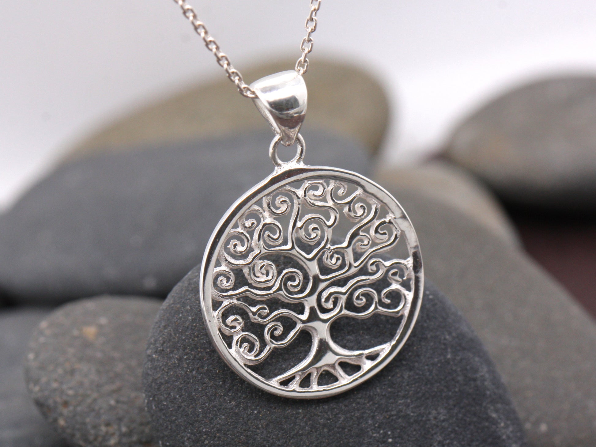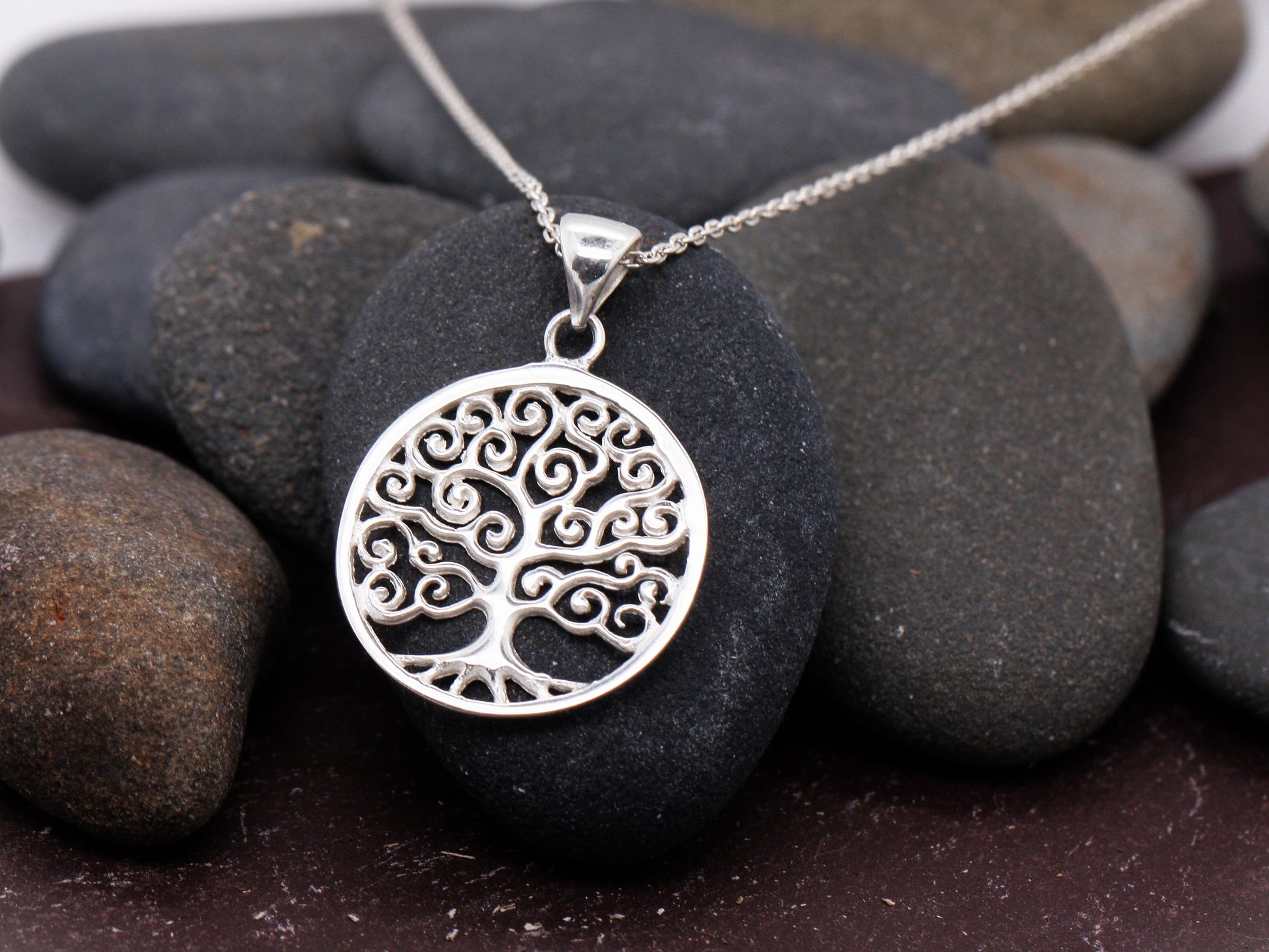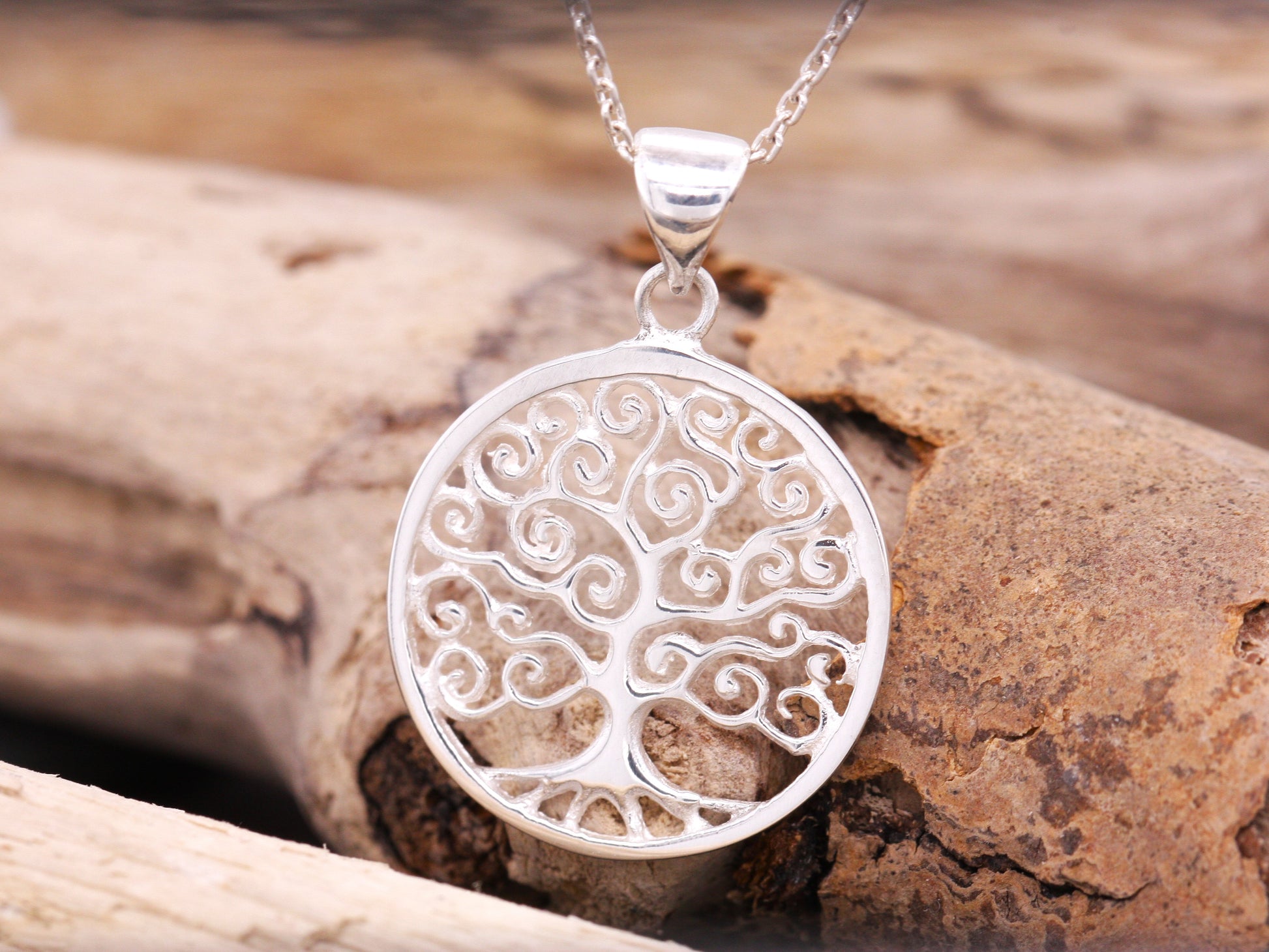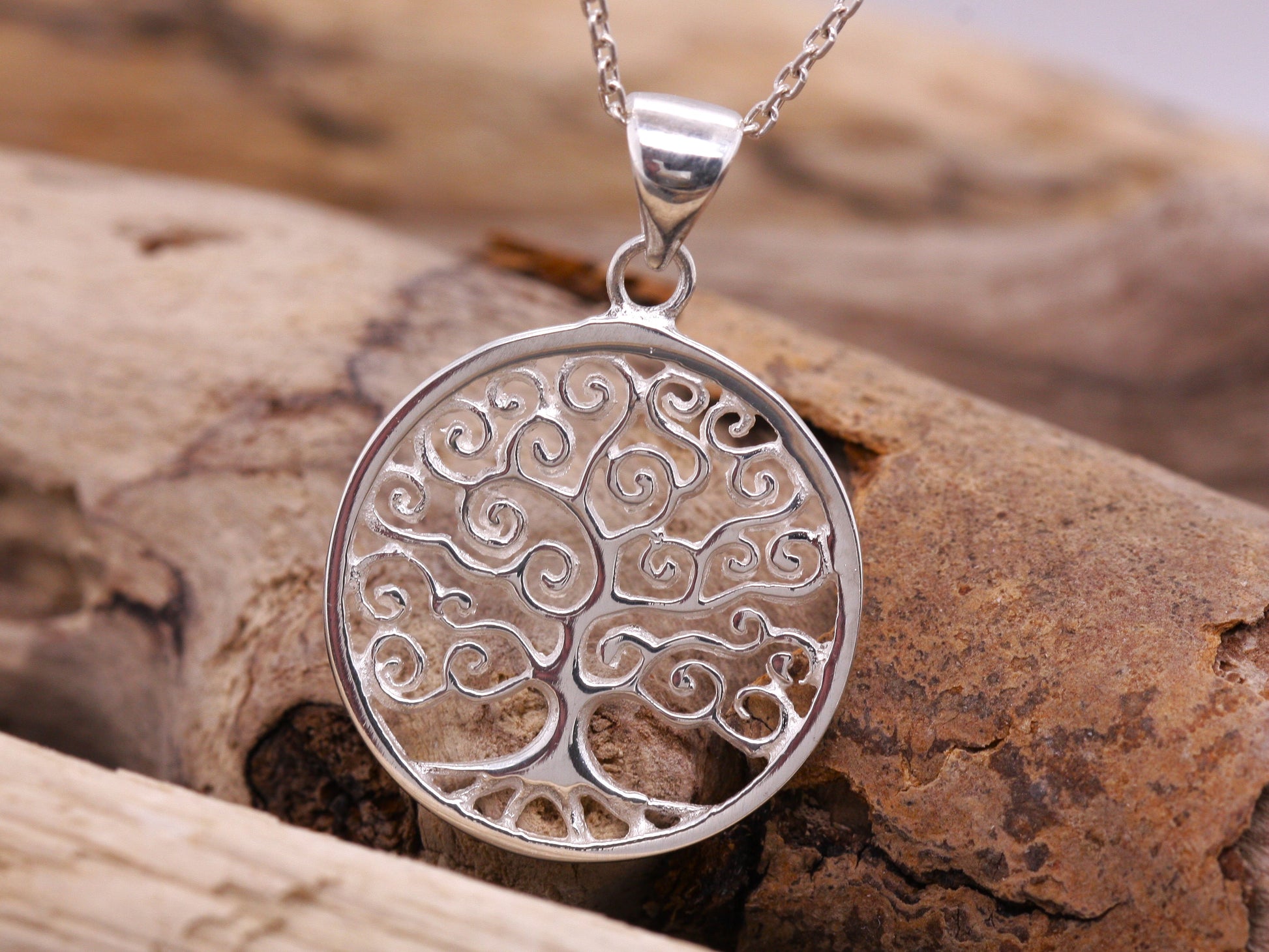 The pendant features a flat, circular motif with a cut-out tree design including swirling branches and root details.